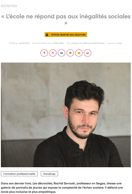 "Dans son livre, Les Décrochés, l'enseignant Rachid Zerrouki dresse une galerie de portraits de jeunes qui expose la complexité de l'échec scolaire. Il défend une école plus inclusive et plus empathique."