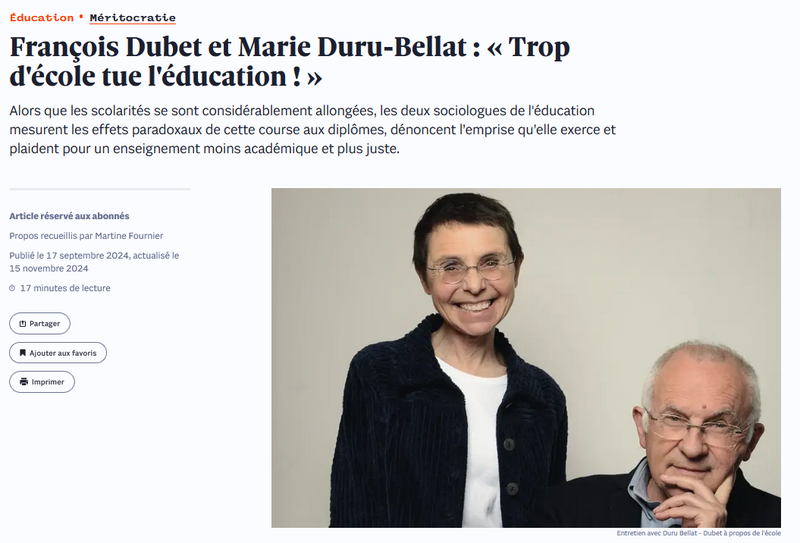 François Dubet et Marie Duru-Bellat : « Trop d'école tue l'éducation ! » - Sciences Humaines (2024)